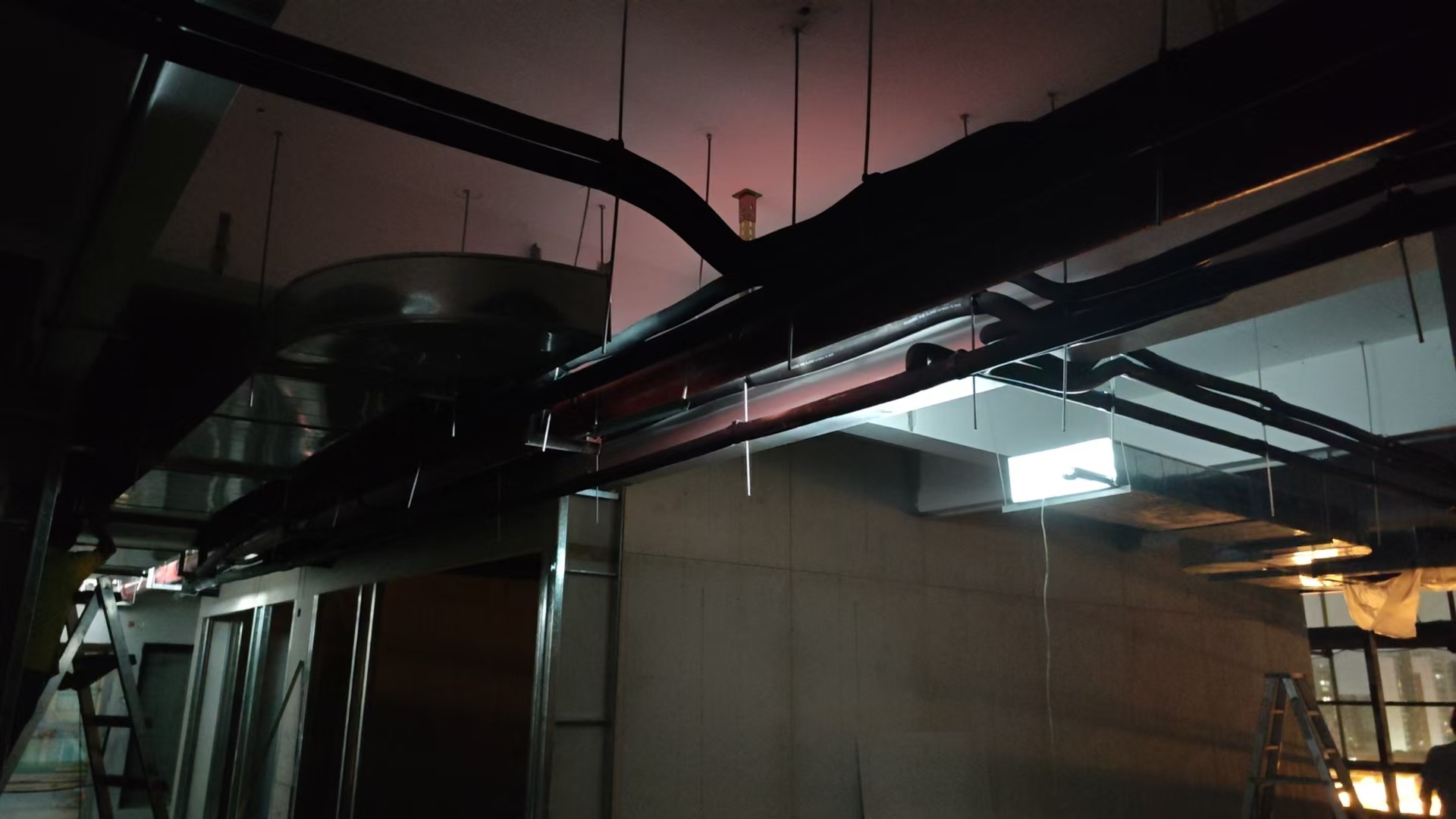 描述:夜间或漆黑环境内,对风管的严密性进行检测,采用100W以上的光源在风管管道内,检查风管外表面是否有光源,根据不同材质风管分别采用密封胶或焊接方式进行密封,确保风管100%完全密封。